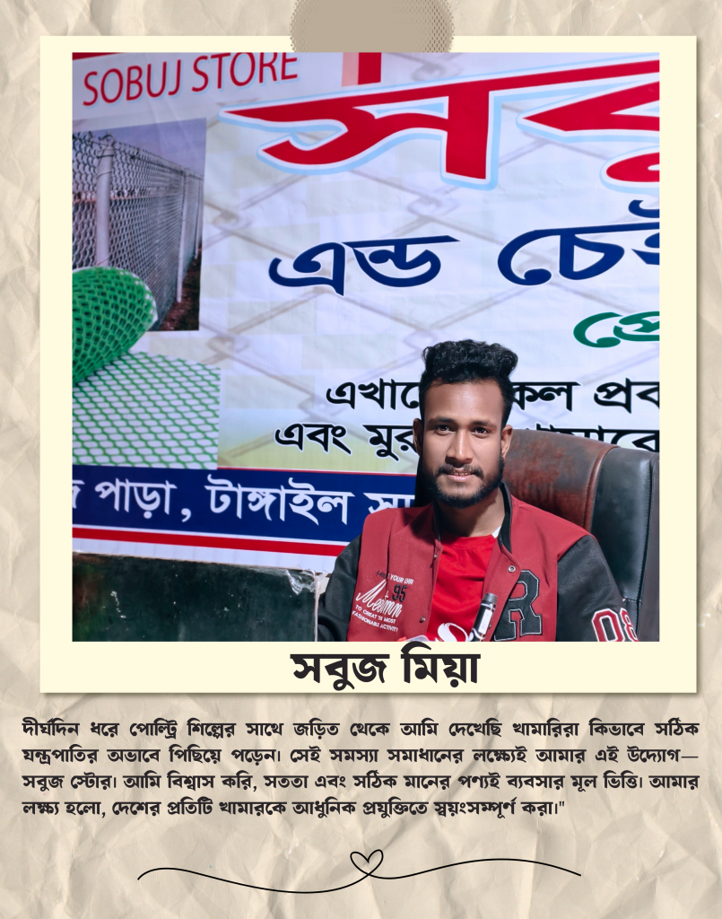 আসসালামু আলাইকুম, আমি সবুজ । একজন উদ্যোক্তা হিসেবে কাজ করছি বাংলাদেশের পোল্ট্রি শিল্পকে এগিয়ে নেওয়ার লক্ষ্যে। সবুজ স্টোর ও আমাদের নিজস্ব নেট ফ্যাক্টরির মাধ্যমে আমরা চেষ্টা করছি খামারি ভাইদের হাতে সরাসরি কারখানা ও চায়না থেকে আমদানিকৃত সেরা পণ্যটি পৌঁছে দিতে। আপনার খামারের উন্নয়নে আমরা সবসময় পাশে আছি।